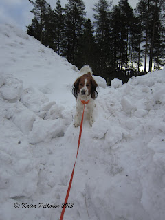 22.2.2013 perjantaina oli tarkoituksella ns. välipäivä. Päätimme käydä lauantain näyttelypaikalla Bø i Telemarkissa. Matkaa oli n. 30 km ja menimme Sauheradvägenin kautta ja matka kesti rauhallisesti ajaen noin tunnin. Palasimme Notoddeniin Reshjemvegeniä pitkin, jonka etukäteen tiesimme jäiseksi tieksi talvella. Sitä se totisesti oli. Onneksi oli aurinkoista eikä juuri muuta liikennettä. Iltapäivästä kiersimme Notoddenin ympäristöä ja kävimme syömässä kiinalaisessa ravintolassa, joka tarjosi myös länsimaista ruokaa. Päivällä oli ollut asteen plussan puolella, joten illalla vain Veikon tassut pestiin.